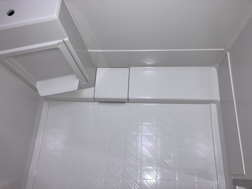 今回、壁面には防水性の高いパネルを貼り付ける施工を実施。パネルは目地が少ないため、カビが生えにくく、掃除もラク。見た目も高級感があり、入居希望者に与える印象もアップします。