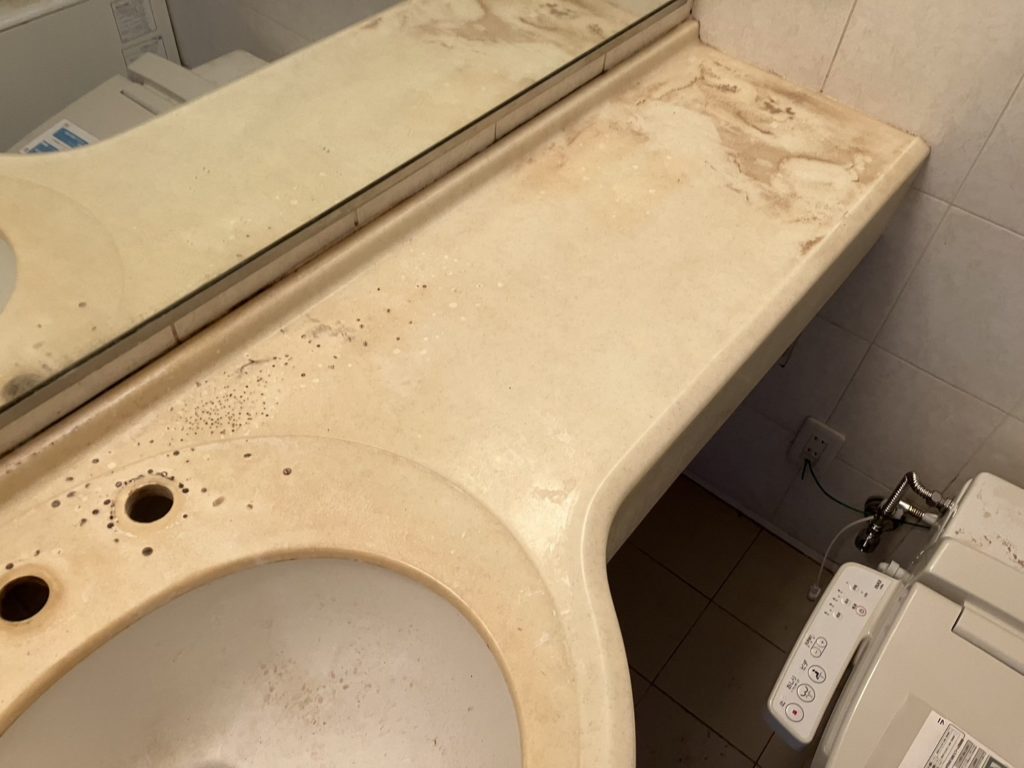 面台は一見するときれいに見えても、経年使用による黄ばみ・擦り傷・水アカの付着など、見た目の劣化が進んでいることが多く、入居者に与える印象を左右します。